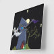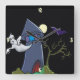 This clip art is an image of a haunted tree house. A dead tree and bushes are decorating the tree house. A full moon is illuminating the ghost and bat as they are seen flying around in the darkness. These clocks are available in round also.