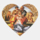 The Doni Tondo or Doni Madonna, Renaissance fine art ,masterpiece by Italian Renaissance master Michelangelo Buonarroti in its original frame.The frame is ornately carved and rather unusual for the five heads it contains which protrude three-dimensionally into space.Located in the Uffizi in Florence, Italy, in bright yellow,white,blue,red,green,brown colours.