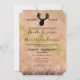 Elegant and Rustic, "The Hunt is Over" Wedding invitation. Deer trophy head silhouette at the top with words "The Hunt Is Over" surrounding him. Background is a sky gradient of pinks and light brown cream with a gradient pink to black field of grass. Buck hand drawn by ©Tina Hesskew of Fishing Hunting Life.