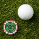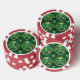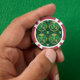 The image shows a poker chip with a vibrant design featuring green ferns and tropical leaves within circular patterns. The chip has a red and white edge.