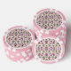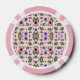 The image shows poker chips with a floral pattern. The front and back feature pink edges and colorful flowers against a light background, creating a playful vibe.