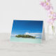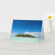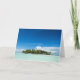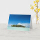 Horizontal greeting card with a desert or uninhabited island with coconut palm trees in the Pacific Ocean.