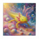In a vibrant underwater dreamscape, a glowing yellow axolotl-like creature moves gracefully among shimmering bubbles and seashells that sparkle with every hue of the rainbow. Its delicate pink fronds fan out like a crown of light, radiating warmth and curiosity. This magical being embodies joy and wonder, inviting you to explore a world where colors dance and the ocean whispers ancient secrets, awakening the imagination with every gentle ripple.