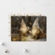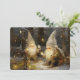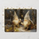 This enchanting holiday card captures a quiet moment of winter magic, featuring two bearded gnomes clad in tall, pointed white hats nestled within a snowy, twilight forest. Rendered in a classic, painterly style, the whimsical pair is shown illuminating the darkness by holding and stringing warm, vintage-style light bulbs that cast a cosy, golden glow against the cool, blue-grey tree trunks. The contrast between the frosty, silent woods and the inviting radiance of the lights creates a heartwarming atmosphere of peace and festive preparation, perfect for sharing a message of hope and wonder this season.
