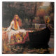 This design features a painting by the English artist John William Waterhouse (1849–1917). It shows the Lady of Shalott, who was a young noblewoman associated with the court of King Arthur. The beautiful woman is sitting in a boat with her long red hair flowing in the wind. There are lit candles on the boat. The original artwork was painted in 1888.