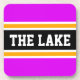 This sporty, colourful design features athletic THE LAKE text inside a highlighted wide black stripe with white and yellow pinstripes against bright pink outer stripes. The text and colours in this design can be personalised.