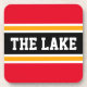 This sporty, colourful design features athletic THE LAKE text inside a highlighted wide black stripe with white and yellow pinstripes against bright red outer stripes. The text and colours in this design can be personalised.
