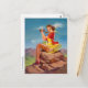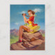 Classic PinUp card showing a PinUp Girl sitting on a rock and is exploring the nature with binoculars, painted by Art Frahm (1907-1981)
