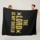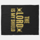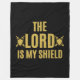 This fleece blanket features an antonio bold print font with golden coloured letters displaying the biblical phrase "The Lord Is My Shield" with a sword and shield icon on each side in this biblical saying theme. This Blanket is made from 100% buttery soft and cosy polyester fleece with edge-to-edge vibrant full colour sublimation printing and double edge stitching with a off-white coloured back machine washable.