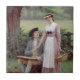 This design features a painting by the English artist Edmund Blair Leighton (1852–1922). It depicts a scene from Tennyson’s 1835 poem, in which a rich Lord pretends to be poor in order to win a woman’s heart. However, in this image, the Lord of Burleigh is dressed elegantly and he is holding the hand of his lover as she stands beside him; they have now accepted each other in love. The Lord is seated with an easel on his lap as he paints a landscape. His true love is is wearing a long dress and holding a wooden basket: perhaps she is foraging food from the countryside or perhaps she has been shopping. The two lovers are together in a rural field with a large tree surrounded by plants and flowers in the background.