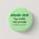 This beautiful button features one of God's names, Jehovah-Jireh which means the Lord will provide, along with the accompanying Bible verse from the book of Genesis.
