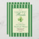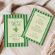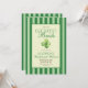 She's the luckiest bride! St. Patrick's day themed, double sided bachelorette weekend invitation with a template for a weekend itinerary. The design features elegant vintage inspired calligraphy, adding a touch of classic sophistication to your announcements. This refined script beautifully complements the overall aesthetic, inviting guests with warmth and style. A backdrop of green stripes offers a serene and inviting canvas, creating a harmonious balance between elegance and charm. This pattern evokes a sense of traditional refinement, perfectly aligning with the old money aesthetic. A delicate watercolor illustration of a four-leaf clovers add a whimsical touch to each piece, artfully arranged to bring a sense of joy and fortune to your celebration, making the bride feel like the luckiest bride on St. Patrick's Day.