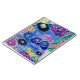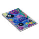 A kaleidoscope of colours forms swirling patterns and floral motifs, creating a lively visual tapestry. The use of bold blues, purples, and greens combines with striking pinks and yellows to evoke an intricate, whimsical feel. The artwork's complexity and vivid colours suggest a playful yet sophisticated design.