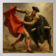 A matador, dressed in an elaborate traditional outfit, elegantly maneuvers with a red cape as a bull charges forward. The scene captures the drama and motion of a bullfight.