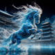 A horse made of water in a fantastic and dynamic Japanese landscape, where you can enjoy your coffee.