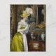 The Mirror (1889) by Gunnar Berndtson is a captivating portrayal of self-reflection, both literal and figurative. The painting features a woman in a vibrant green dress and hat, gazing thoughtfully into a mirror. Her poised yet introspective expression invites the viewer to contemplate her thoughts as she observes herself. The rich colour palette, especially the vivid green of her attire, contrasts beautifully with the softer tones of the room and the reflective surface. Berndtson's use of light and shadow enhances the atmosphere of the piece, creating a delicate balance between the subject's inner world and her outward appearance.