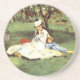 The Monet family in their garden. Edouard Manet . Summer landscape. A woman in a beautiful dress and hat is sitting in the garden under a tree on the grass. A boy is sitting on the grass nearby. Reproduction of famous works of art images in the public domain.