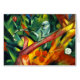 Colourful painting by German artist Franz Marc of a monkey in the jungle sitting on a fallen tree, looking back over his shoulder. Oil on canvas with bright primary colours and stark simplicity. "The Monkey" 1912.