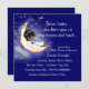 Sweet baby moon and stars we love you to the moon and back baby boy shower invitations. This elegant night time moon and stars baby boy shower invitation is easily customised for your event. You can add your event details in the font style and wording of your choice, as well as change the background colour to whatever you prefer.