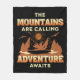 Grunge retro style outdoor illustration with " The mountains are calling, adventure awaits" text design and mountain scene decoration