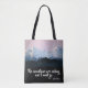 This tote bag features a photograph of a snow-covered Alaskan mountain range at dusk with a beautiful pink-colored sky. The quote by John Muir is: "the mountains are calling and I must go."