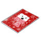Polar bear muzzle in a red plaid scarf on a red background with white snowflakes.