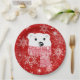 Polar bear muzzle in a red plaid scarf on a red background with white snowflakes.
