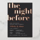 Modern rehearsal dinner invitations feature chic black and white styling with "the night before" in oversized rose gold foil retro lettering. Personalise with your ceremony rehearsal and dinner celebration details beneath.