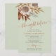 Modern bohemian botanical watercolor boho autumn fall flowers and foliage with dried leaves making a chic autumn wedding rehearsal dinner invitation with a trendy handwriting calligraphy script and earthy terracotta beige color palette on a light sage green background.