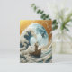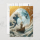 An old man in a small boat fishes in a giant wave with a large moon in the background. He is dressed in white robes and is holding a fishing rod. The wave is crashing around him, but he seems unfazed.