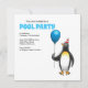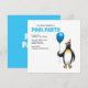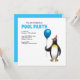 The party-ready penguin is holding a blue balloon with his right mitten and a party hat on his head.