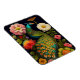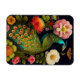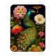 Magnet featuring a colourful peacock and a variety of enchanted flowers. Botanical digital painting in a modern Haeckel style.