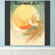 In this ethereal artwork, a majestic phoenix soars gracefully before an immense golden sun, its radiant plumage cascading like molten fire. The circular arc surrounding the scene appears as a celestial gateway, adorned with flickering starlight that echoes the bird's divine presence. Subtle wisps of clouds and distant orange-hued mountains add depth, grounding the mythical creature in a dreamlike landscape. This depiction feels like a celestial celebration—perhaps the phoenix's eternal rebirth intertwined with the cycles of the cosmos.