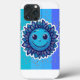 This vibrant phone case features a cobalt blue smiling face with simple diamond-like details, adorned with intricate holographic designs that reflect rainbow colours. It stands out against a pure white background, seamlessly blending joy and modern style.