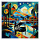 A.I .created print of vibrant scene features a person playing a piano against a mesmerizing, starry night sky above a colourful cubist, surreal landscape includes rolling hills, trees, and a lake reflecting the sky's luminous celestial bodies