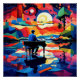 A.I .created print of vibrant scene features a person playing a piano against a mesmerizing, starry night sky above a colourful cubist, surreal landscape includes rolling hills, trees, and a lake reflecting the sky's luminous celestial bodies