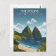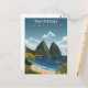 Escape to the lush paradise of the Caribbean with this stunning The Pitons Travel Card. This vintage-style illustration captures the majestic emerald peaks of Gros Piton and Petit Piton as they tower over the turquoise waters of the Caribbean Sea and white sandy beaches.