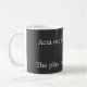 A gray and white mug with a latin phrase. "Acta est fabula plaudite" was reported to be the last words of the Roman emperor Augustus. It means "The play is over, applaud!"