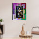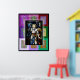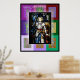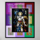 A stained glass portrait of the young girl is surrounded by little pop art echoes