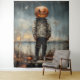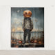 The image depicts a figure standing in an outdoor setting, wearing a worn-out, rugged military-style outfit with boots. Instead of a head, the figure has a large carved pumpkin with a menacing, glowing jack-o'-lantern face. The sky is overcast, giving the scene an eerie atmosphere, and the ground is scattered with dry vegetation and two small pumpkins, emphasising the Halloween theme. The painting style is reminiscent of classic Americana, evoking a sense of both nostalgia and unease.