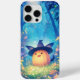 In an enchanting forest setting, a smiling cat pumpkin wearing a witch hat is surrounded by vibrant flowers and glowing foliage under a mystical blue sky. The scene evokes a whimsical, magical atmosphere perfect for a Halloween-themed story.