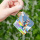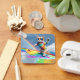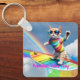 A high-quality, digitally rendered image featuring an anthropomorphic ginger and white cat in a full-body action pose. The cat is perfectly balanced atop a brilliantly coloured rainbow surfboard, its gaze coolly hidden behind reflective orange-lensed sunglasses. It sports a snug, short-sleeved rainbow-striped top. The entire scene is set against a simple, pale grey backdrop to emphasise the subject's striking colours and motion.