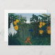 "The Repast of the Lion" (1907) by Henri Rousseau presents a vivid and captivating scene where a lion devours its prey in a lush jungle setting. The painting showcases the fierce and natural power of the wild, with the lion depicted in a moment of dominance, tearing into the carcass of an animal. The rich colours of the jungle, with its exotic plants and thick foliage, add to the intense, almost surreal atmosphere of the scene. Rousseau’s use of bold, flat colours and his naïve style emphasise the rawness of nature and the primal instinct of the lion. This piece reflects the artist's unique approach to depicting untamed wilderness, full of vivid and fantastical imagery.