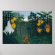 "The Repast of the Lion" (1907) by Henri Rousseau presents a vivid and captivating scene where a lion devours its prey in a lush jungle setting. The painting showcases the fierce and natural power of the wild, with the lion depicted in a moment of dominance, tearing into the carcass of an animal. The rich colours of the jungle, with its exotic plants and thick foliage, add to the intense, almost surreal atmosphere of the scene. Rousseau’s use of bold, flat colours and his naïve style emphasise the rawness of nature and the primal instinct of the lion. This piece reflects the artist's unique approach to depicting untamed wilderness, full of vivid and fantastical imagery.