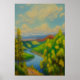 A blue river going through the forest with green trees on both side of the river, you can see a small open hill further down by the river, blue sky with a lot of cloud on it. This is a AI generated art Impressionist Painting.