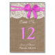 The rustic pink bow wedding collection is a stunning design featuring a lovely rustic burlap effect background with a romantic vintage white lace effect trim and a stunning pink bow. These table number cards can be personalised for your special occasion and would make the perfect table centerpiece for your wedding, bridal shower, engagement party, birthday party and much, much more.