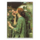 Young woman with dark red hair reaches upward towards a climbing rose to smell the fragrance. Fine art from the 19th century by John William Waterhouse.