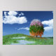 Four seasons appear on a lone tree standing in a grassy meadow. The top branches are bare and snow-covered, giving way to pink blossoms, which turn to dark green leaves, which turn orange and gold and fall to the ground. Amid the autumn leaves on the ground are blue spring flowers and melting snow.
