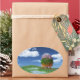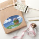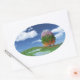 Four seasons appear on a lone tree standing in a grassy meadow. The top branches are bare and snow-covered, giving way to pink blossoms, which turn to dark green leaves, which turn orange and gold and fall to the ground. Amid the autumn leaves on the ground are blue spring flowers and melting snow.
