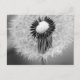 A close up black and white photograph of Dandelion seeds. Some seeds have already blown away, while the remaining seeds create a circle on the white pin cushion of a flower head.